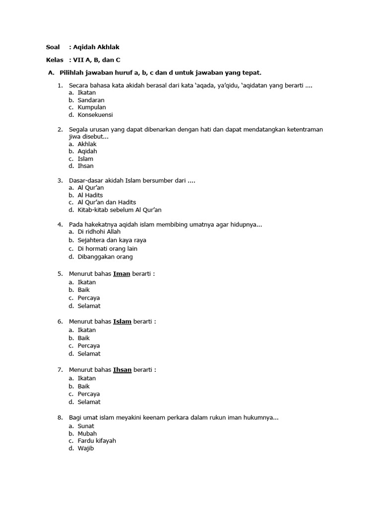 Artikel ini akan menyajikan panduan lengkap mengenai contoh soal ujian Aqidah Akhlak kelas 1 SD, lengkap dengan berbagai jenis soal, penjelasan mendalam, serta tips yang dapat membantu guru dalam menyusun soal dan siswa dalam mempersiapkan diri. Kami akan membahas soal pilihan ganda, isian singkat, menjodohkan, dan uraian singkat, mencakup berbagai topik penting dalam kurikulum Aqidah Akhlak kelas 1.