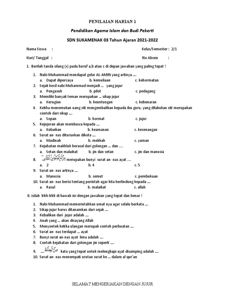 Contoh untuk Pendidikan Agama Islam (dapat disesuaikan dengan agama lain).